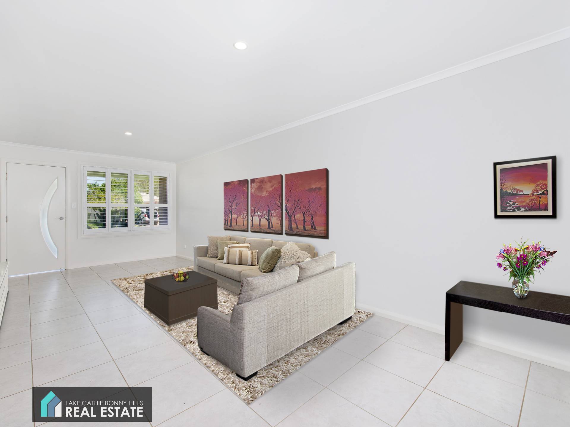 Three year old 3 bedroom Torrens Title, Courtyard styled home, in wonderful position within 5 minutes level walk of Woolworths Shopping Complex with Cafes’, Post Office, Bakery, Tavern, etc. and not much more to the Beach or Lake. Medical Centre and Bowling Club only minutes away. Home features two separate living areas with the main area opening onto a delightful north facing under roof alfresco dining overlooking natural reserve. Built-in wardrobes to all bedrooms, main bedroom boasts en-suite, lovely pristine white plantation shutters to all windows and external sliding doors and complete with dishwasher, range hood etc. Separate WC with vanity. Double garage has internal access, electric remote door and one side drive through providing access to the rear gardens or parking for trailer, campervan etc.  A real gem. Be quick.