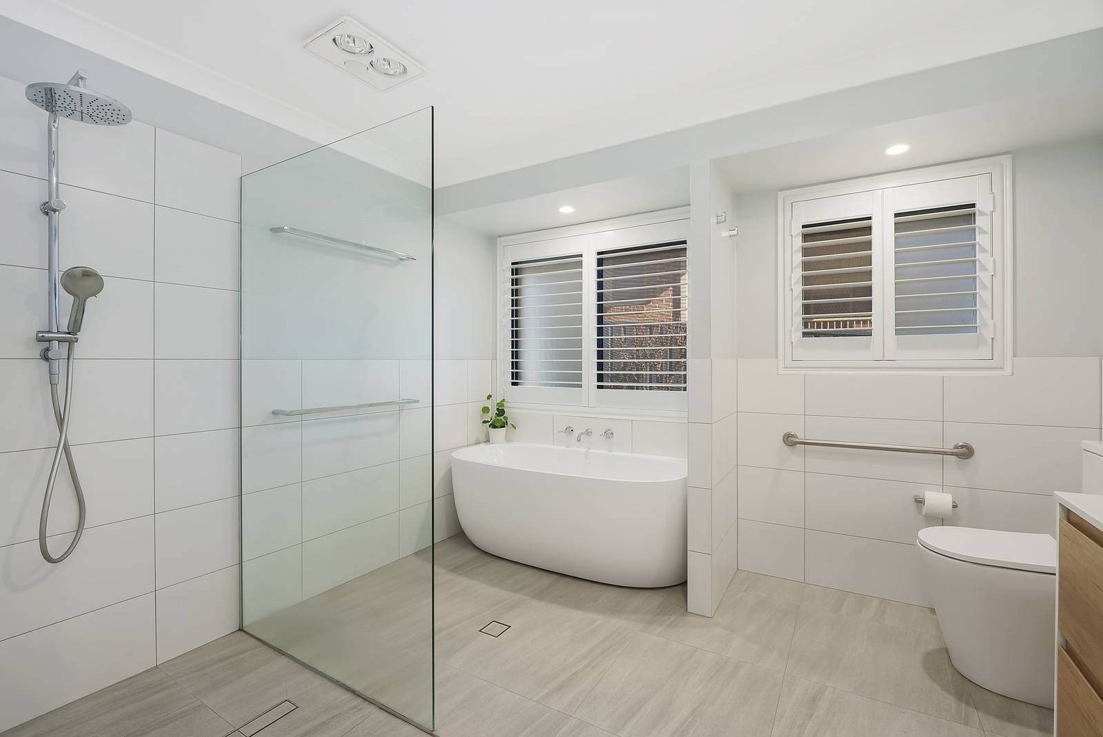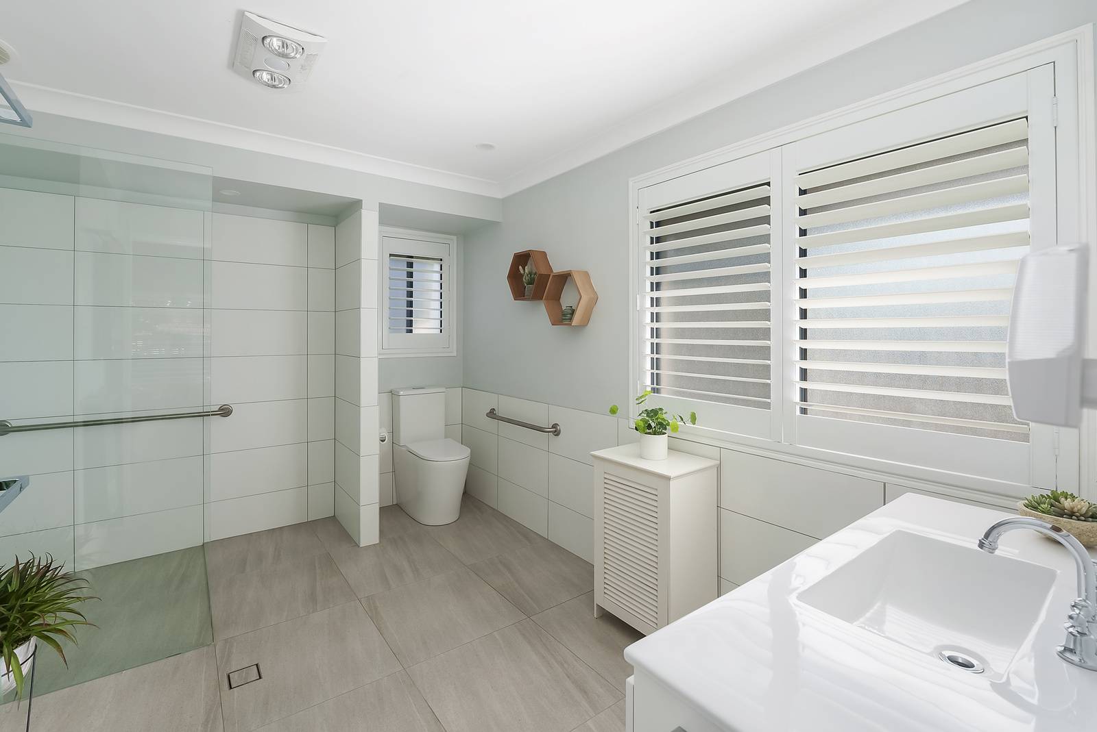 The family bathroom is modern and substantial in size with a stunning barn door as the central feature, wall hung vanity, a lux freestanding bath tub and plantation shutters to complete the picture!