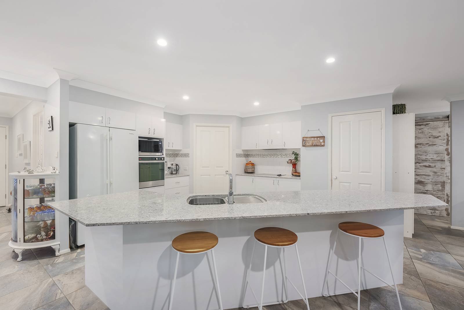 The kitchen is a dream, showcasing an oversized central island bench with stone benchtop, ample storage space, walk-in pantry, breakfast bar and a new dishwasher.