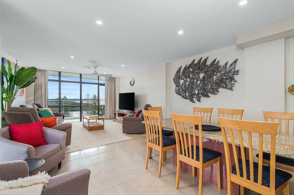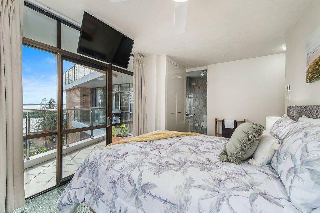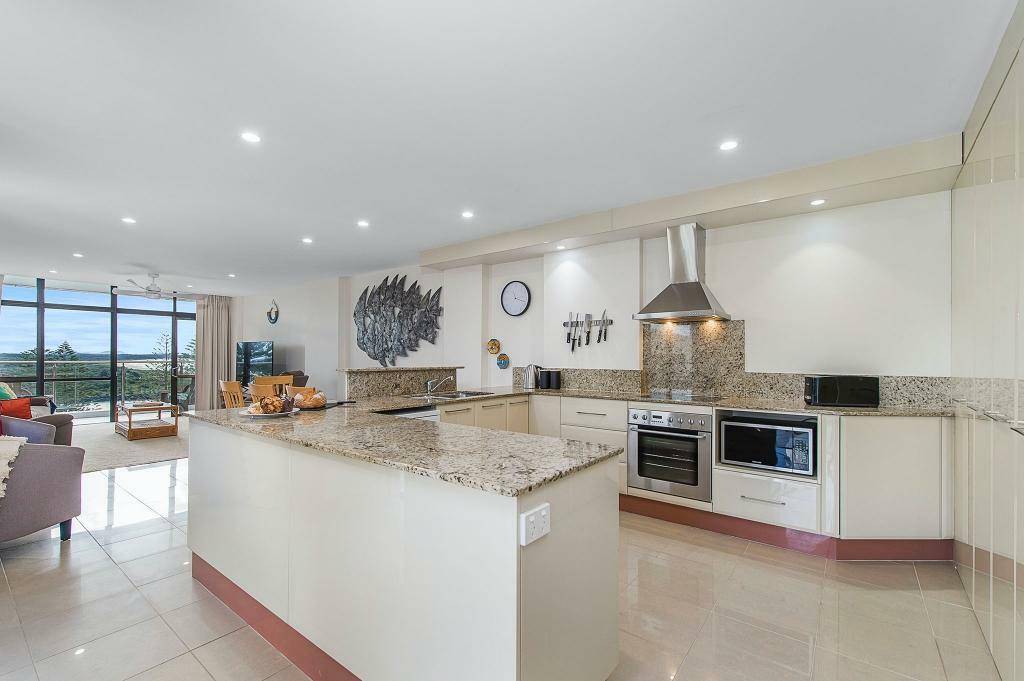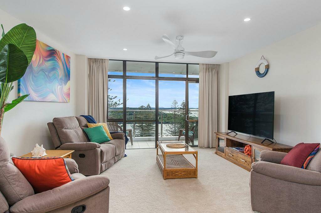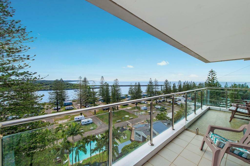 Located on the top floor (8th floor) in the Tasman Towers building, accessible by elevator. Inside you will find an open plan lounge, dining and kitchen with ocean views and multiple front and side verandahs overlooking the water with views along Port Macquarie North Shore beach and Town Beach. The side verandah has an outdoor table and Weber BBQ.