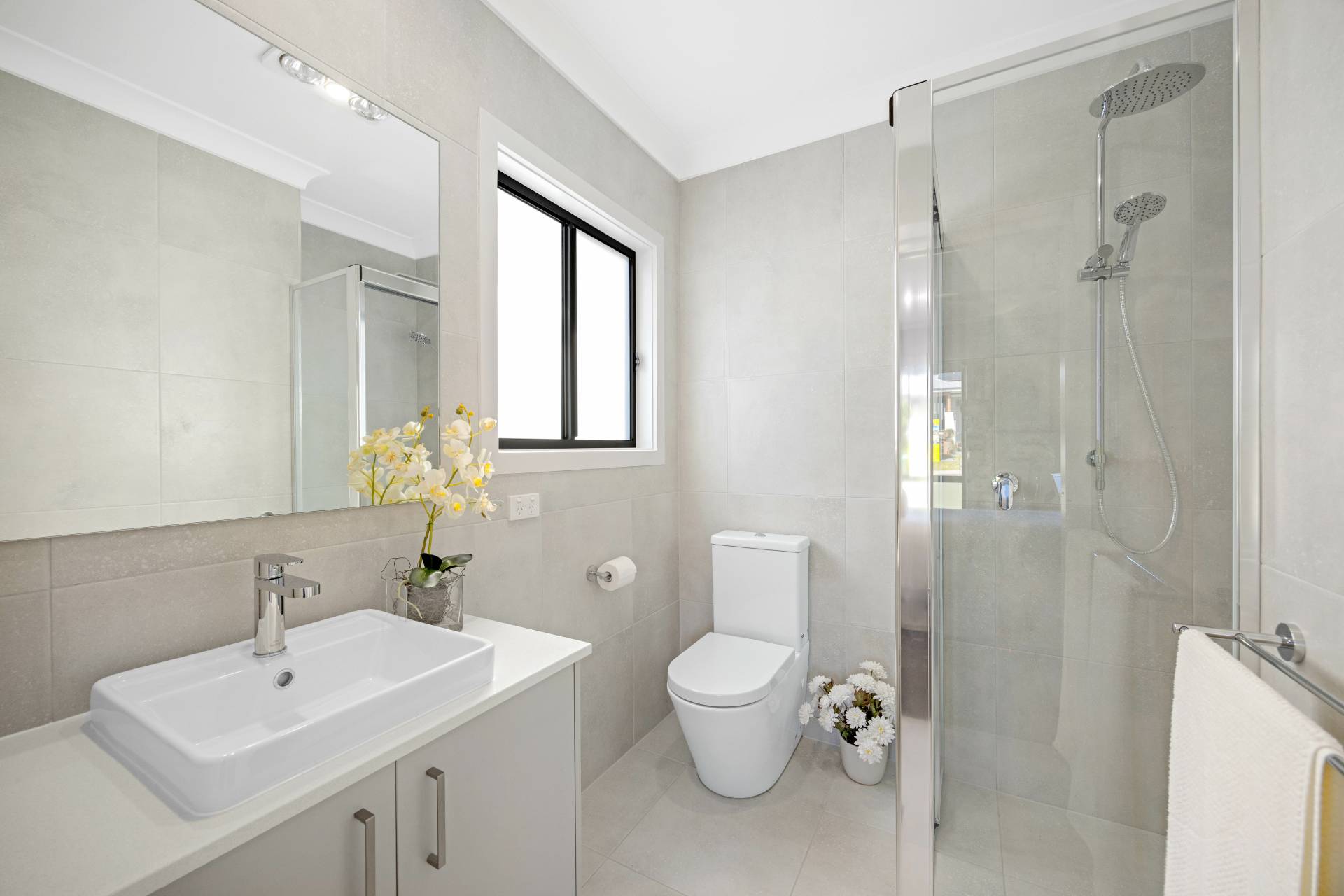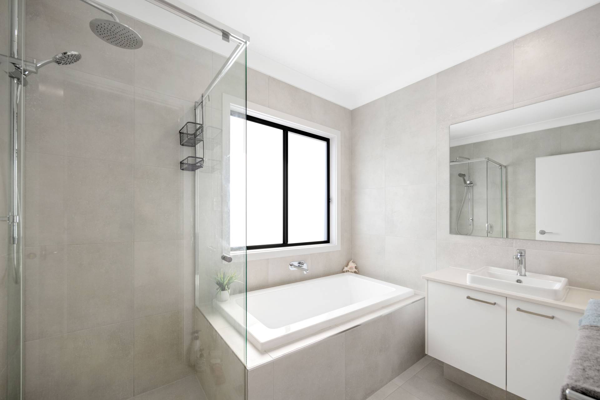 - Modern bathrooms with floor to ceiling wall tiles and quality tapware