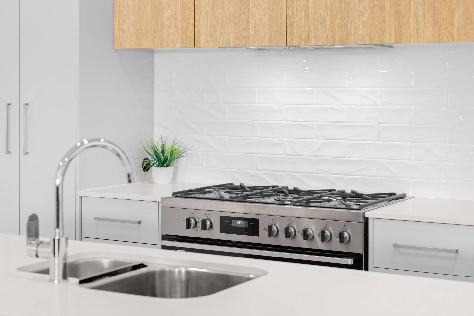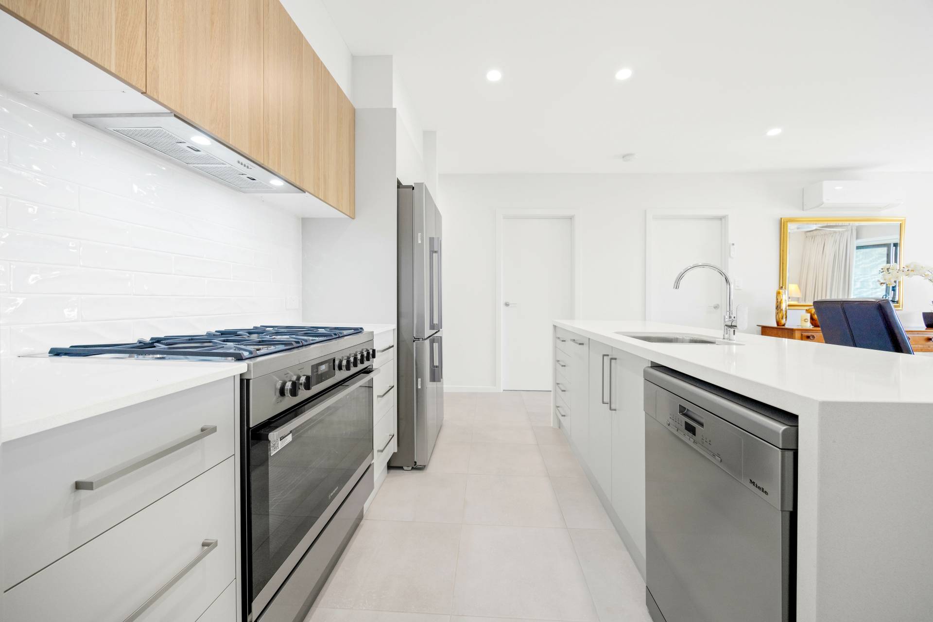 Complete with an entertainers kitchen and top of the line appliances, including 900mm cooker with gas cooktop, Miele dishwasher, stone benches with waterfall island that also serves as a breakfast bar, and on-trend overhead timber look look cabinetry.