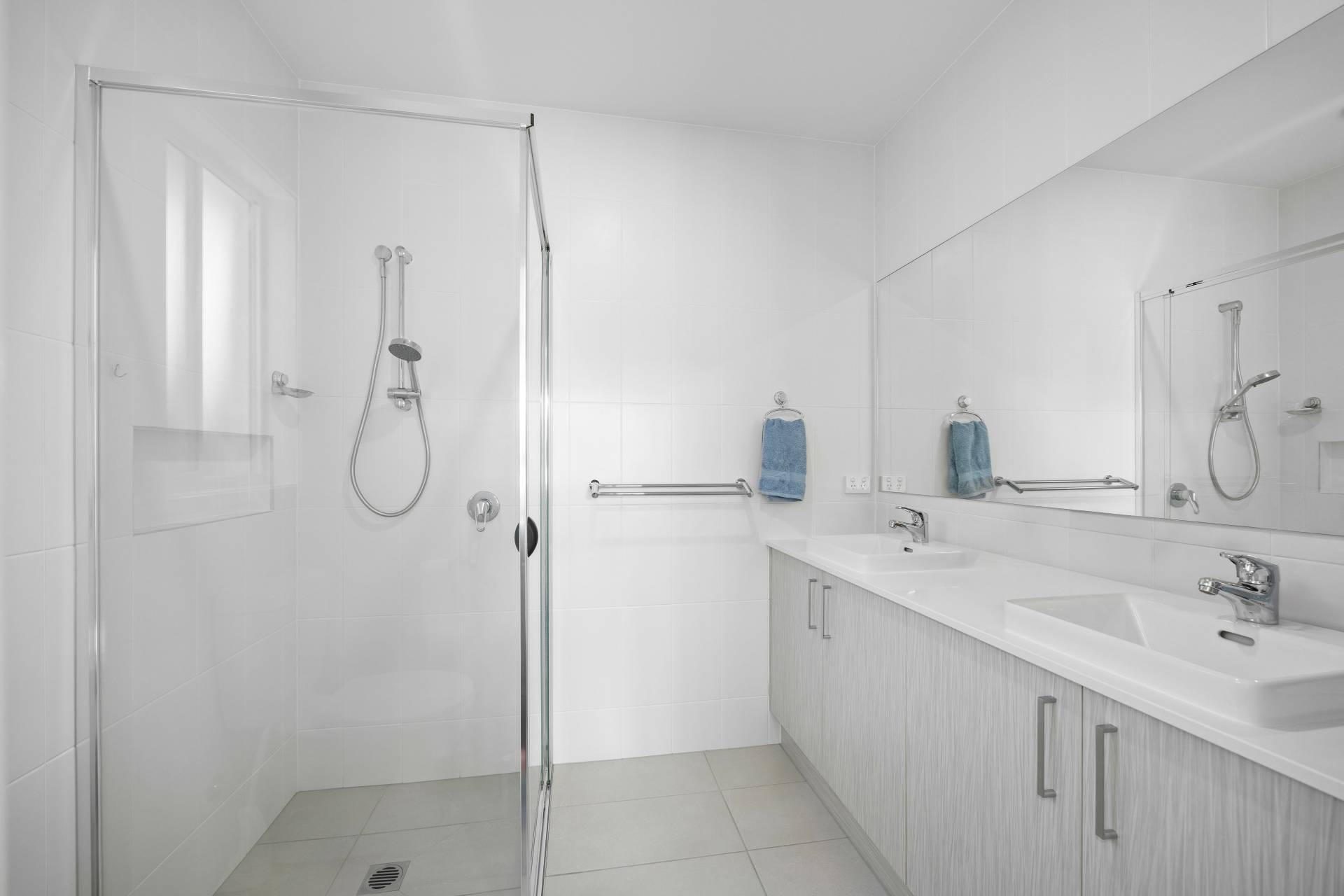 - Modern bathrooms, floor to ceiling wall tiles, double sink vanity