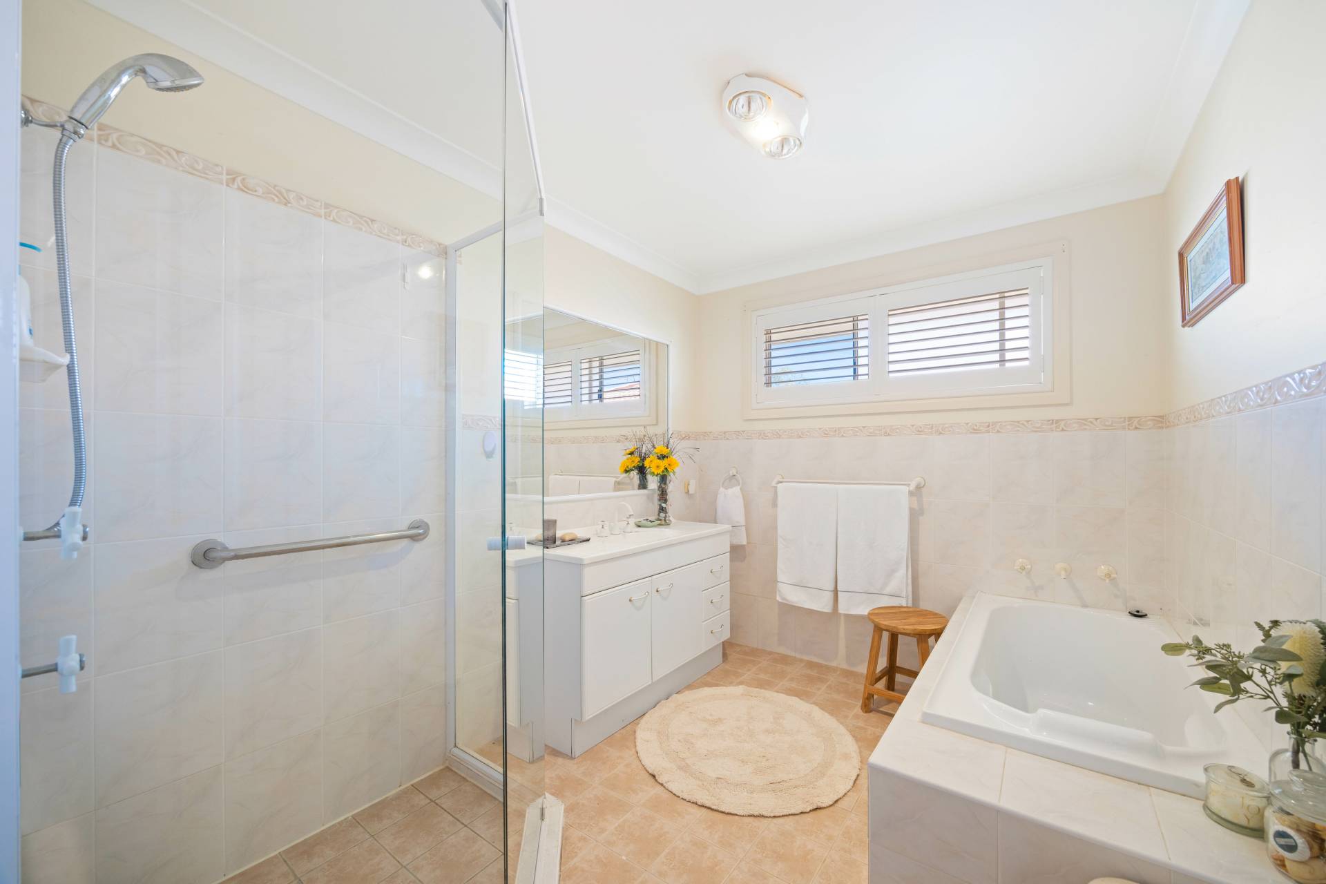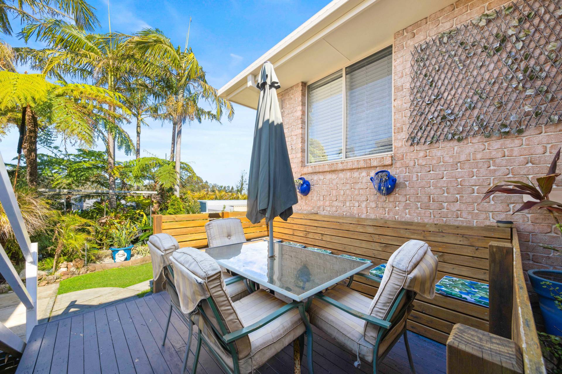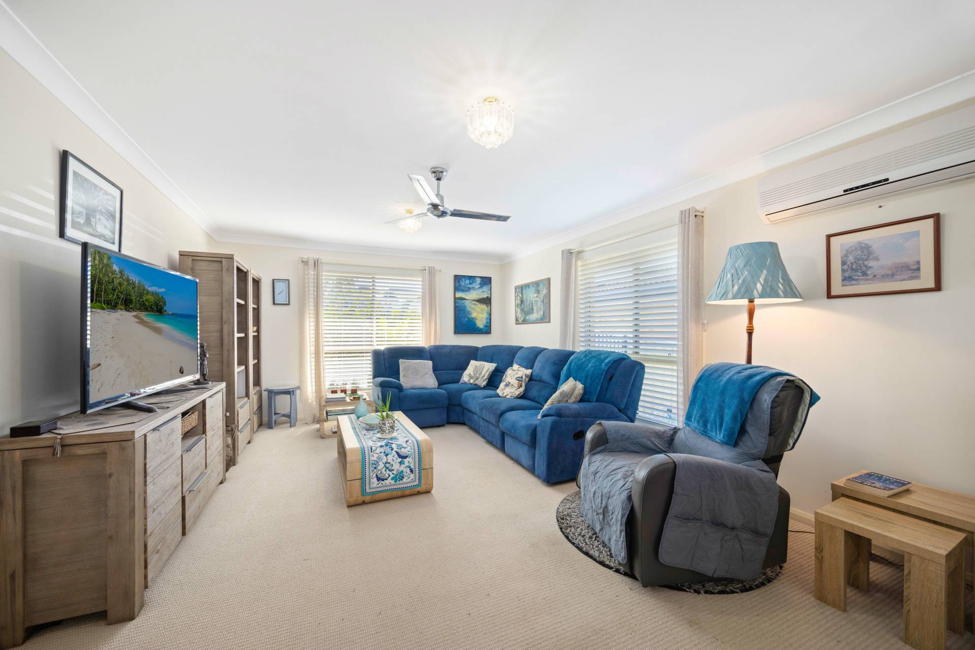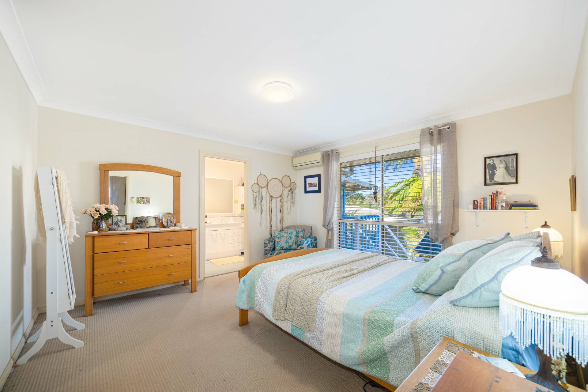 The master bedroom has its own reverse cycle air conditioning, walk-in wardrobe, and a private ensuite bathroom, while the other bedrooms all offer built-ins.