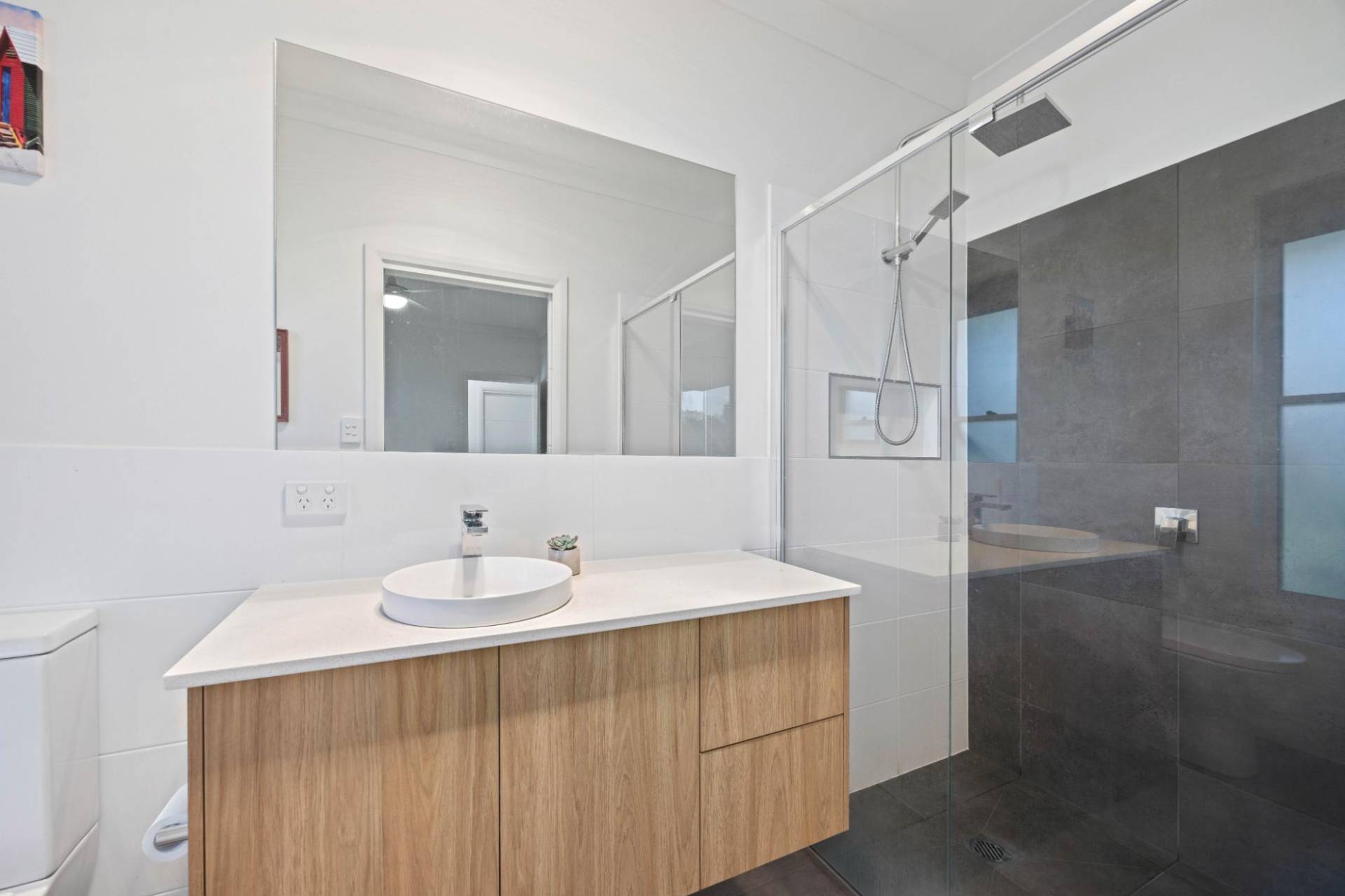 The luxury appointed bathrooms feature timber-look wall hung vanities with stone tops and above counter basins, custom shower niches, finished with a modern colour palette.