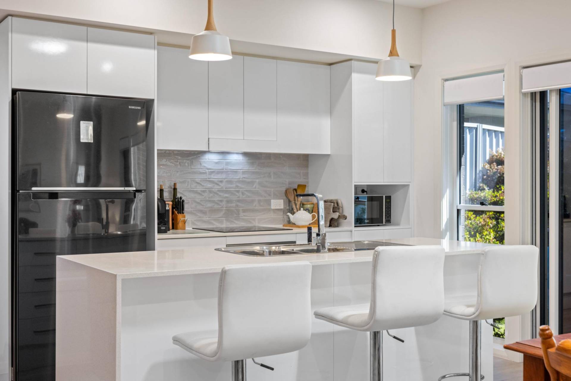 At the heart of the home is a white gloss kitchen, with Caesar stone bench-top, high end stainless steel appliances and contrasting sub way tile splashback, enhanced by statement pendant lighting.
