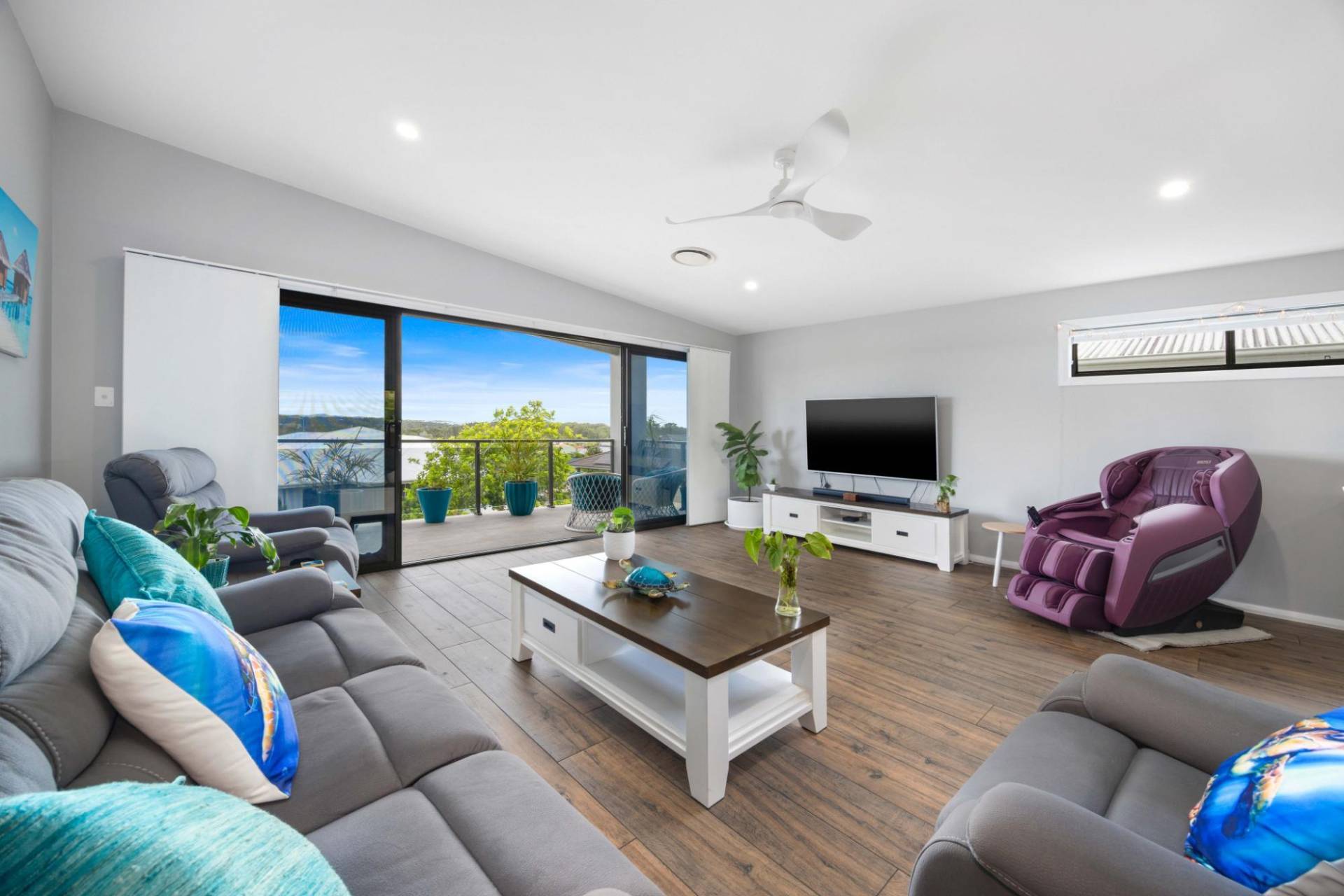 Nestled within the scenic beauty of Bonny Hills, this nearly-new, elegant residence offers a private sanctuary, enhanced by calming coastal breezes and elevated distant views of the mountains, ocean and coastline.